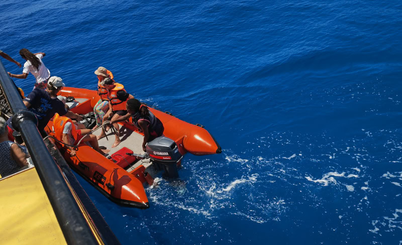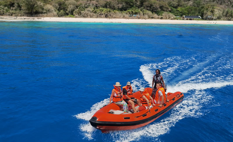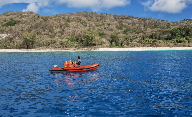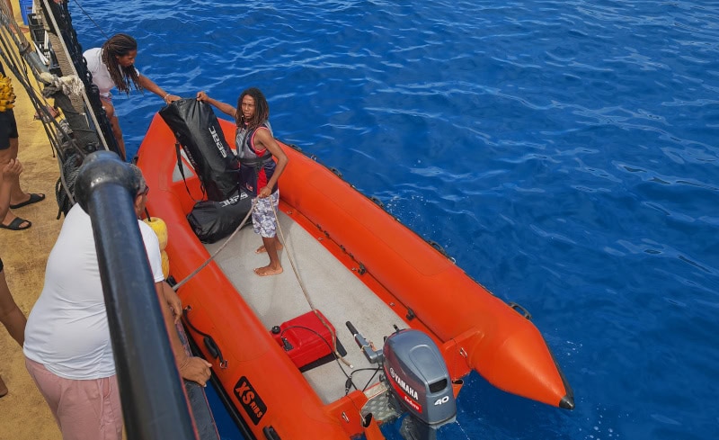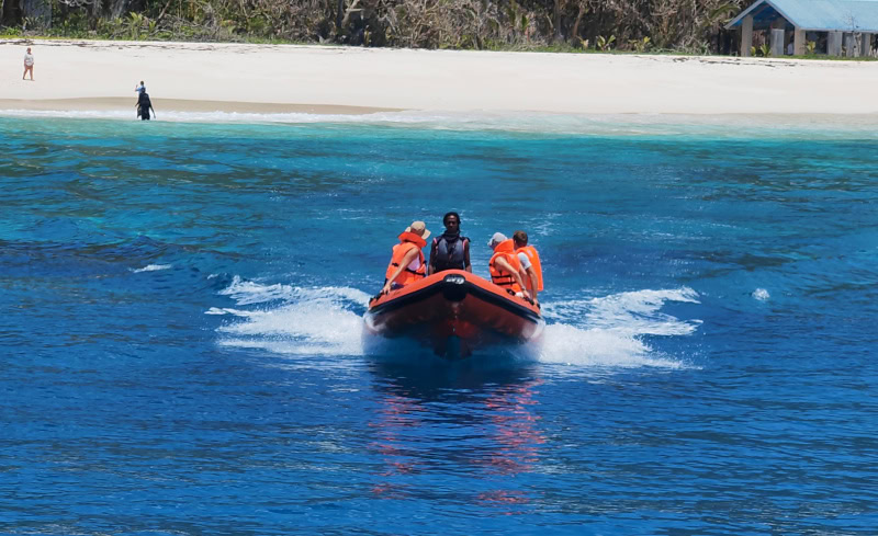 Wir wurden nicht wie üblich mit unserem Dingi an Land gebracht. Unsere Sachen, Rucksäcke und Schuhe wurden in einer wasserdichten Tasche verstaut. Wir mussten Rettungswesten anlegen und wurden mit einem großen Schlauchboot zur Insel gefahren, schon etwas abenteuerlich.