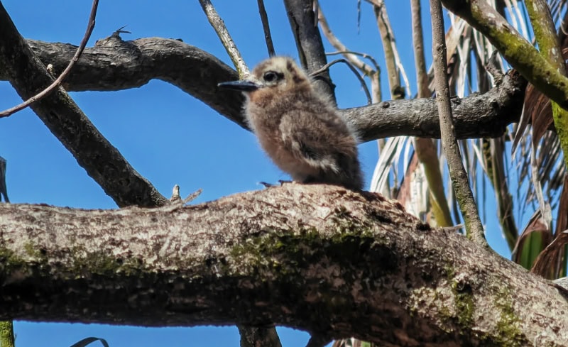 Auf einem Ast über unseren Köpfen saß ein kleiner Jungvogel ganz allein und wartete wahrscheinlich auf die Fütterung. Ein echt flauschiges Knäul.