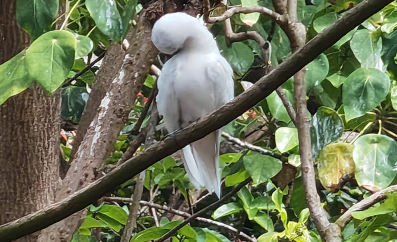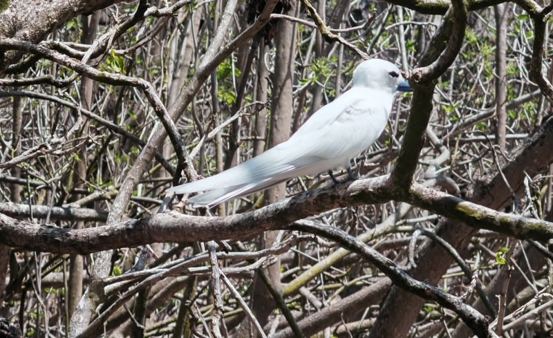 Immer wieder entdeckten wir weiße Feenseeschwalben in den Bäumen, mal allein, aber auch sehr viele Pärchen. Die Feenseeschwalben haben ein weißes Gefieder, schwarze Augen und einen blau-schwarzen Schnabel. Der Schwanz ist tief gegabelt und lang. Sie werden etwa 30 cm groß und haben Schwimmhäute zwischen den Zehen.