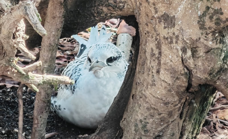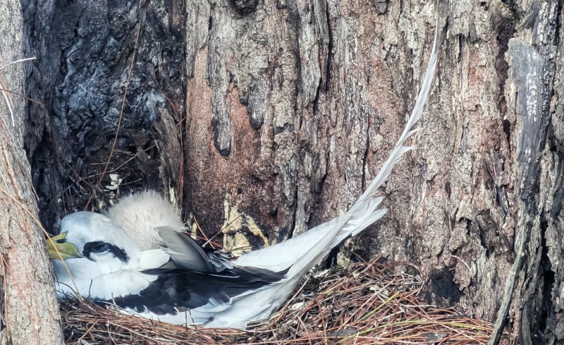 Am Boden in Wurzelgabelungen der Bäume entdeckten wir brütende Weißschwanz-Tropikvögel mit Jungen. Sie sind die Kleinsten der drei Tropikvogel-Arten. Er verbringt die meiste Zeit auf dem offenen Meer der tropischen Ozeane.