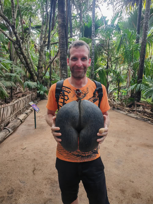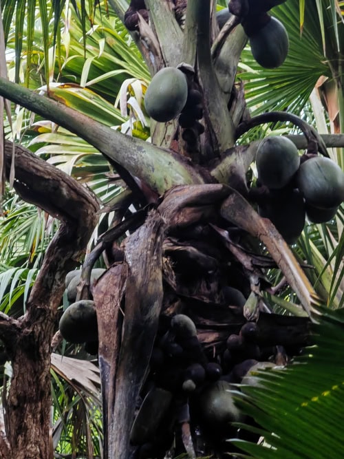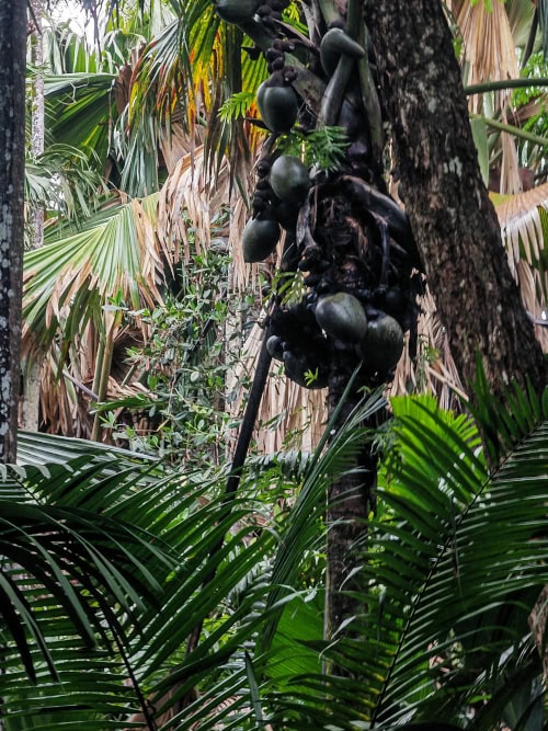 Wir wandern auf gut ausgebauten Wegen durch den ungeordneten Wald der seltensten Palmen der Erde, die nur hier wachsen. Rechts und links säumen unzählige Palmen, an denen die Coco de Mer wächst, den Weg. Die berühmte Coco de Mer ist eine doppelte Kokosnuss, die dem Becken einer Frau ähnelt. Aus diesem Grund hielt der General Gordon die Seychellen für den Garten Eden und er glaubte, sie sei die verbotene Frucht aus dem Paradies.