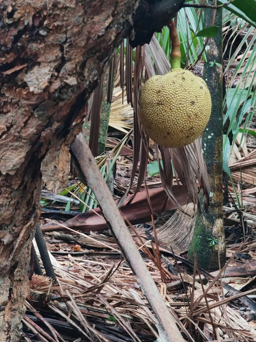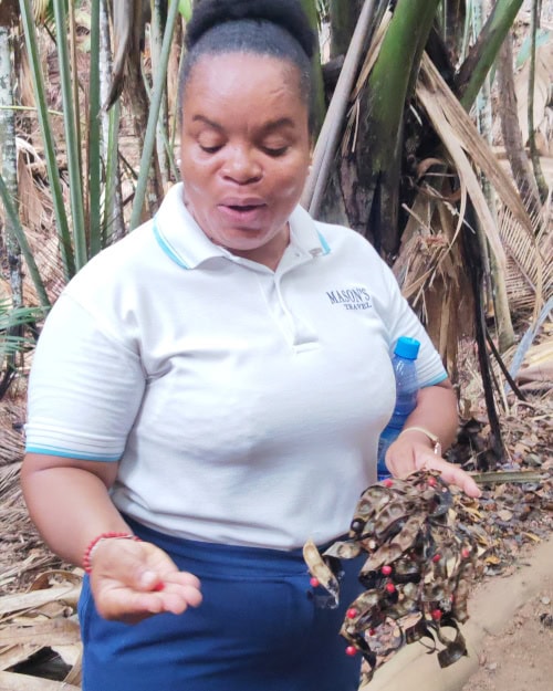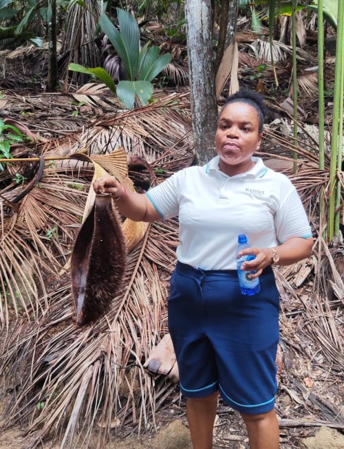 Die Coco de Mer ist die Frucht der Seychellenpalme, die weltweit größte Kokosnussart. Die Seychellenpalme ist eine kräftige, häufig hohe Fächerpalme, die zweihäusig getrenntgeschlechtig ist. Es gibt also weibliche und männliche Palmen. Immer wieder geht unser Blick nach oben. Die Seychellenpalme wächst natürlicherweise nur auf Praslin und Curieuse, das älteste Exemplar ist rund 300 Jahre alt und 27 m hoch.