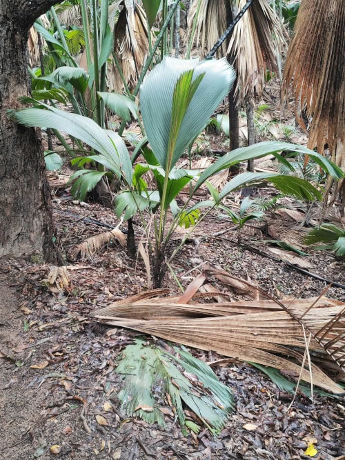 Der weibliche Baum bringt eine herzförmige Frucht von bis zu 25 kg hervor, die doppelte Kokosnuss ähnelt dem Becken einer Frau. Der größte Samen ist bis zu 18 kg und die Keimzeit beträgt 3 – 6 Monate. Die Coco de Mer Nuss braucht 6 – 7 Jahre bis sie voll ausgebildet ist. Ausgewachsene Palmen können bis zu 25 Meter hoch werden.